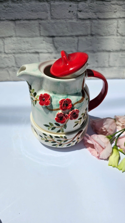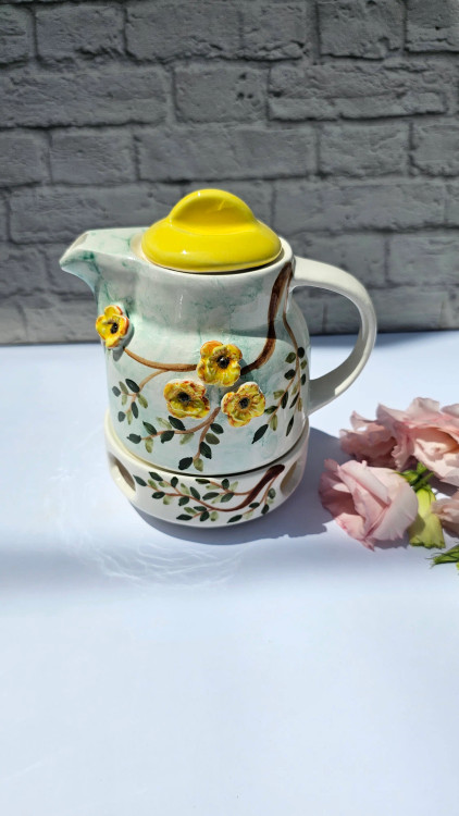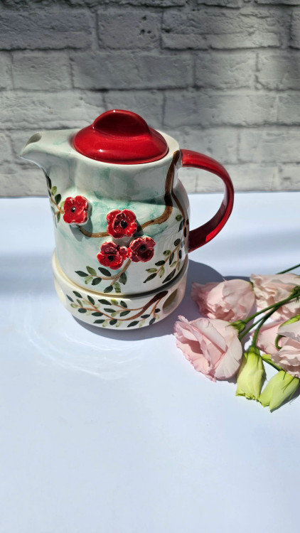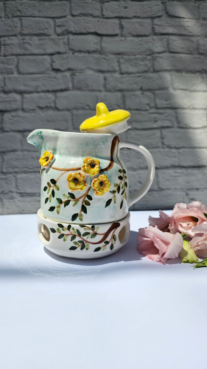 قوری و وارمر سرامیکی گرد طرح گل درختی
