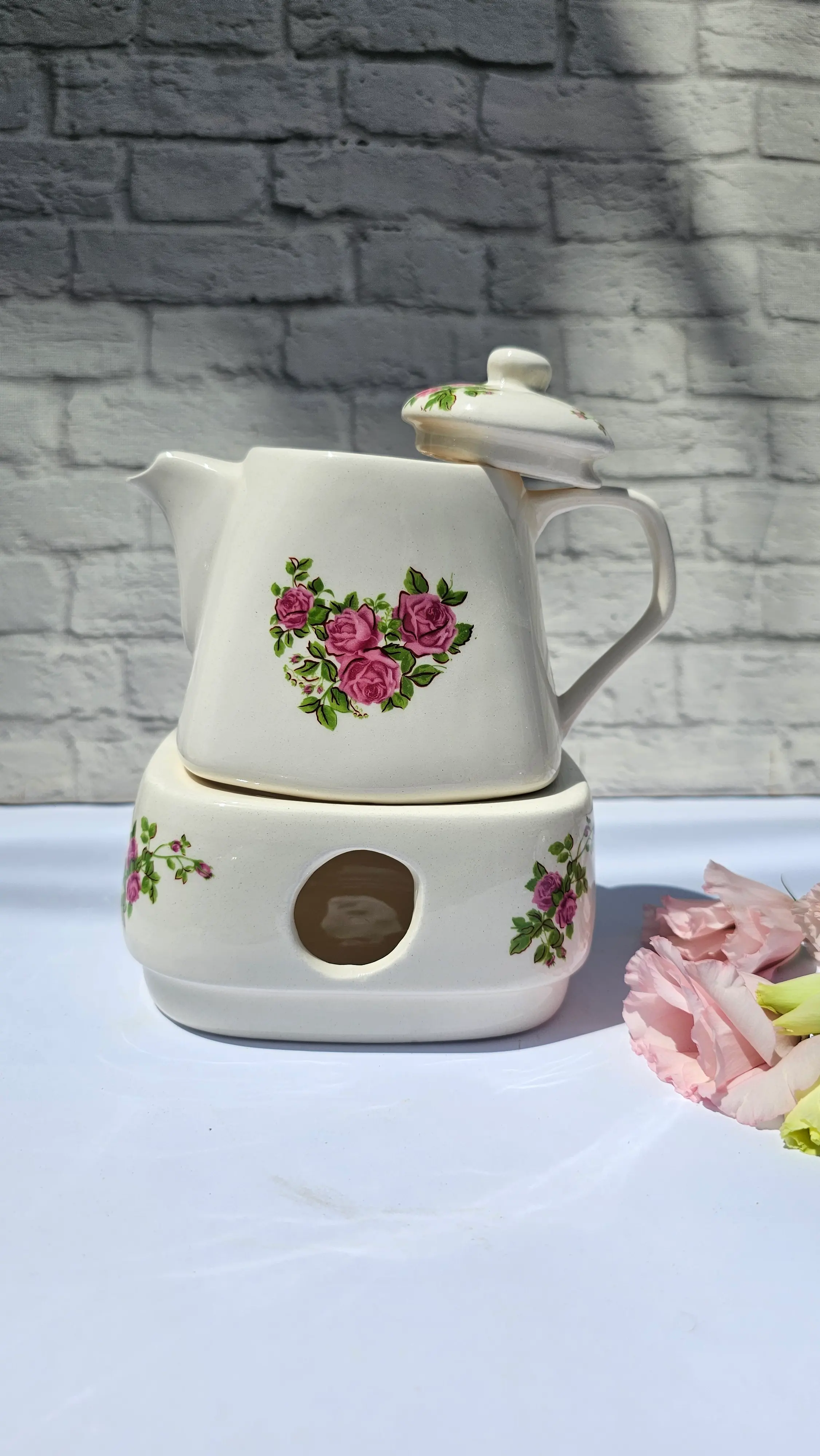 قوری و وارمر سرامیکی مربعی طرح گل سرخی