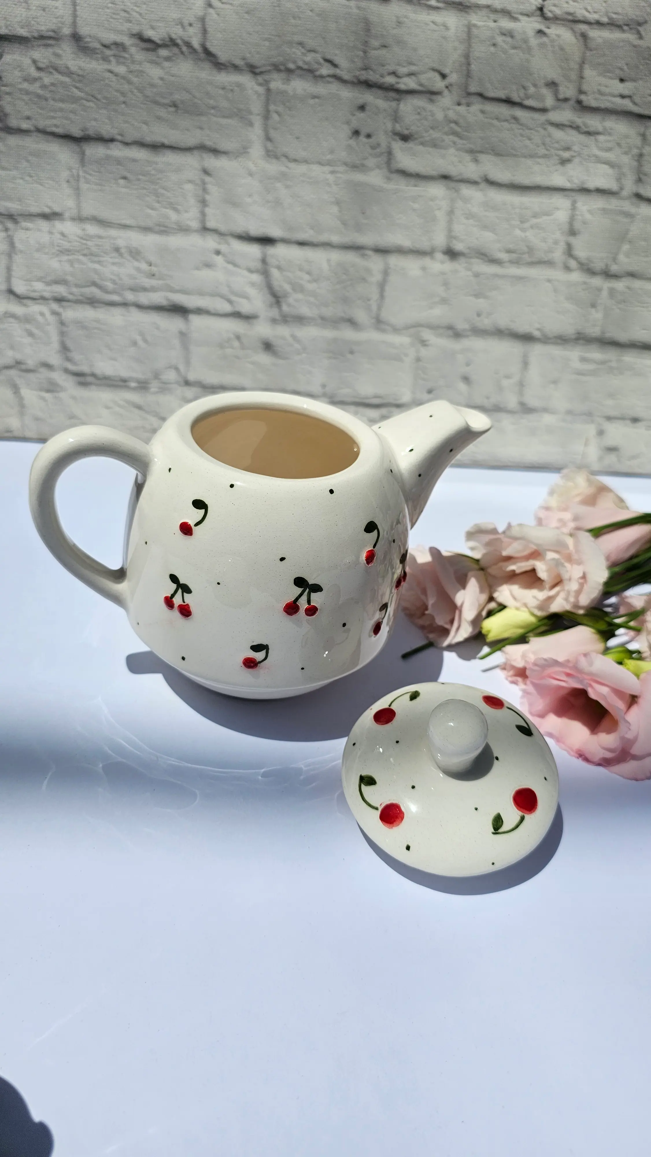 قوری سرامیکی دستساز طرح گیلاسی با درب سفید