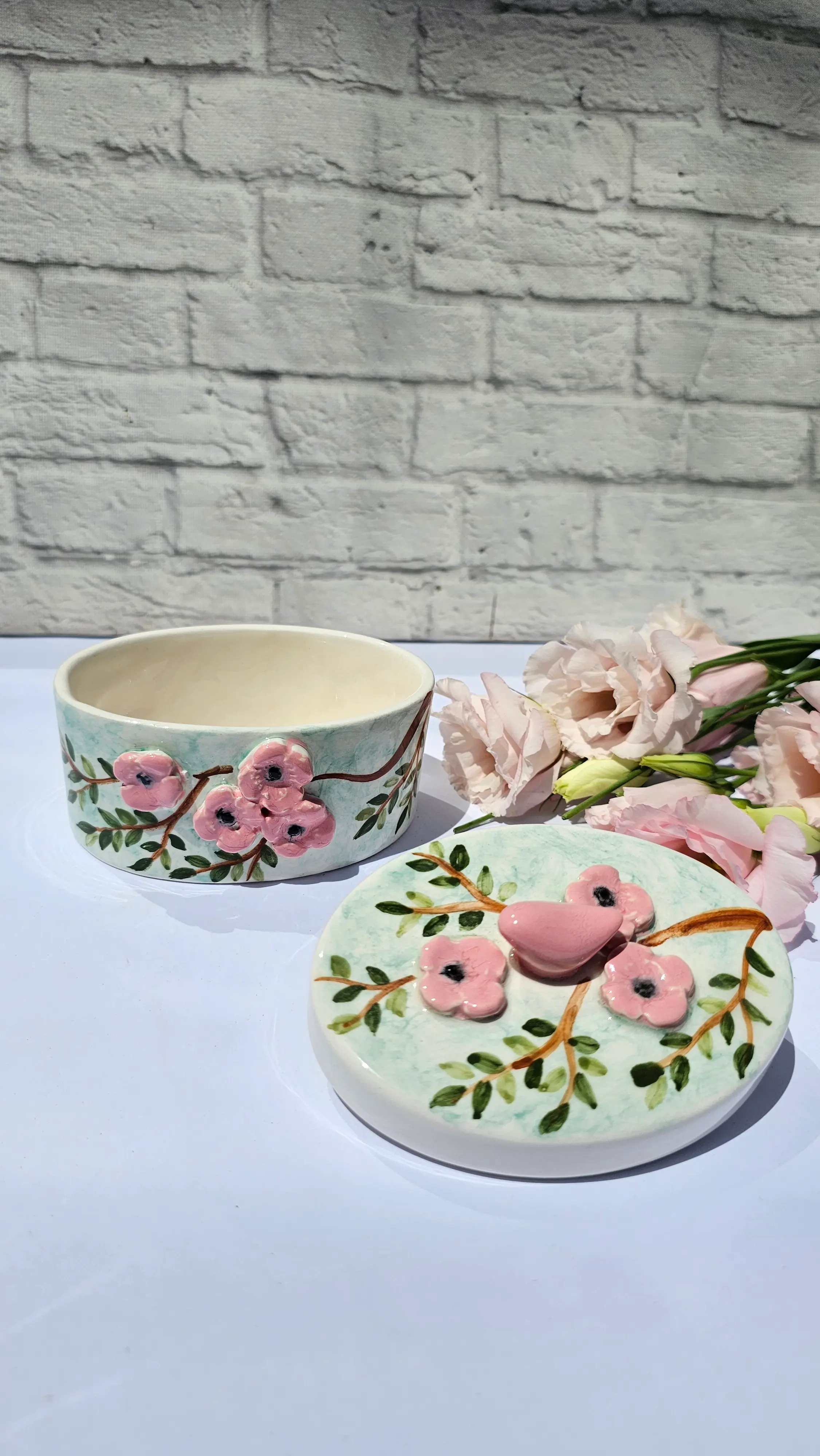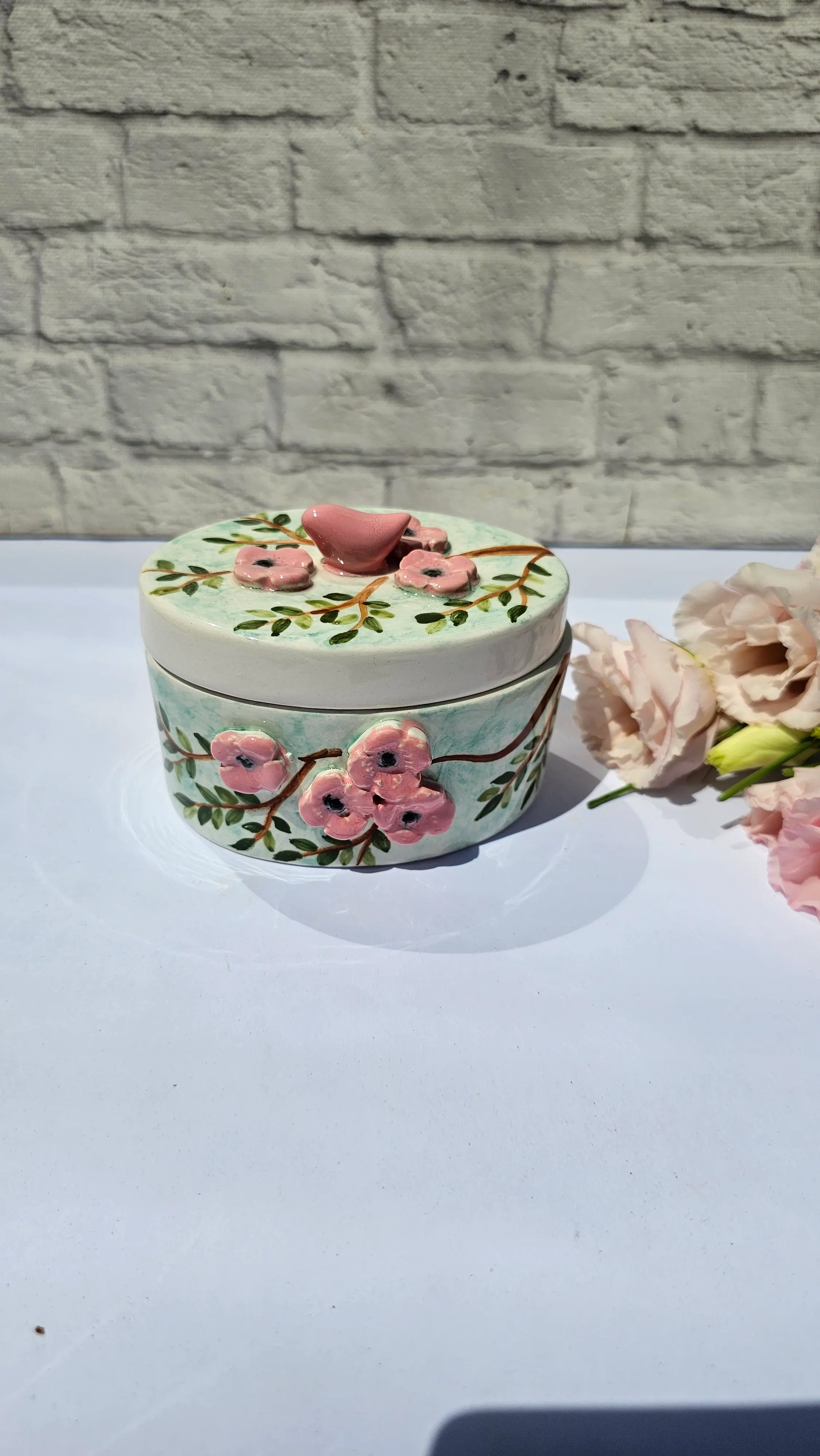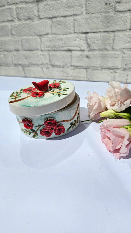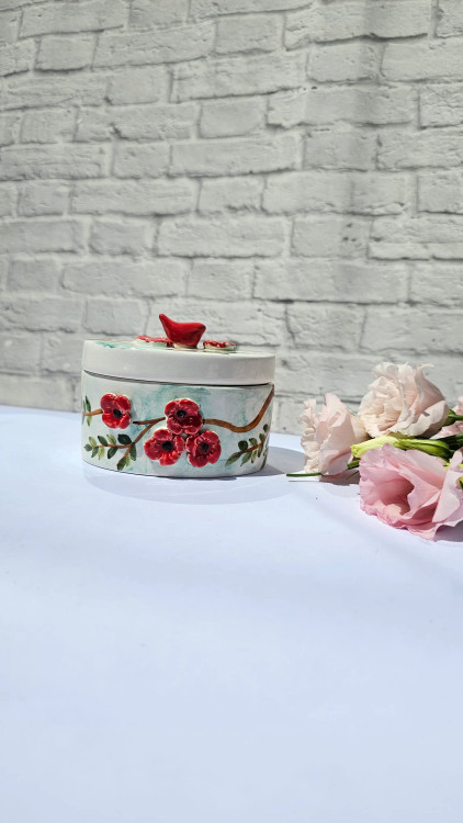 همچنین، یک پرنده قرمز کوچک روی درب این قندان نشسته که با حالت آرام و دلنشین خود، داستان طبیعت و زیباییهای آن را روایت میکند. این پرنده نمادی از صلح و لطافت است که این محصول را از نمونههای مشابه متمایز میکند.