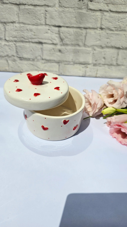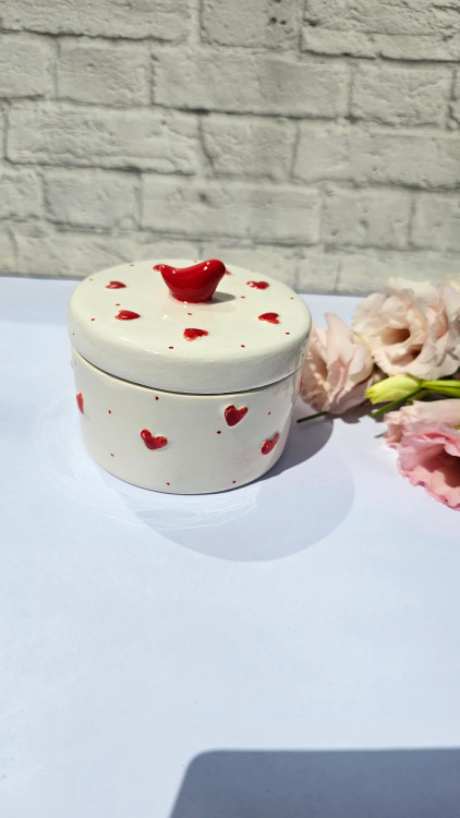 بر روی بدنه و درب این قندان، طرحهای دستی قلبهای کوچک و قرمز به زیبایی نقش بستهاند. این طراحی ساده و دلنشین، حسی از عشق و شادی را منتقل میکند و آن را به یک هدیه عالی برای عزیزانتان تبدیل میکند. دستگیره درب نیز به شکل یک پرنده قرمز کوچک طراحی شده که به این اثر، شخصیتی خاص و هنری میبخشد و آن را از یک ظرف ساده به یک قطعه دکوراتیو تبدیل میکند.