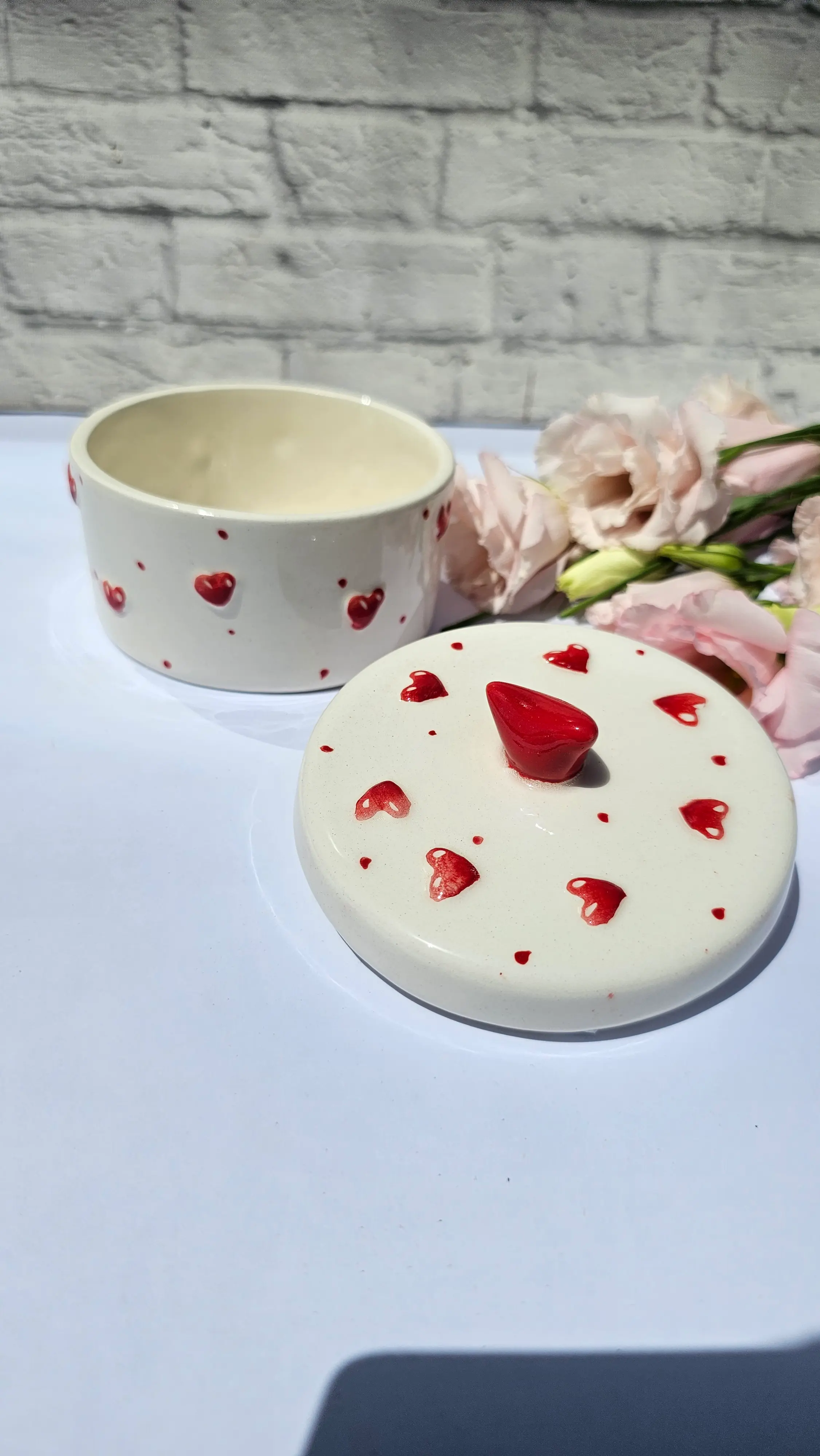 بر روی بدنه و درب این قندان، طرحهای دستی قلبهای کوچک و قرمز به زیبایی نقش بستهاند. این طراحی ساده و دلنشین، حسی از عشق و شادی را منتقل میکند و آن را به یک هدیه عالی برای عزیزانتان تبدیل میکند. دستگیره درب نیز به شکل یک پرنده قرمز کوچک طراحی شده که به این اثر، شخصیتی خاص و هنری میبخشد و آن را از یک ظرف ساده به یک قطعه دکوراتیو تبدیل میکند.