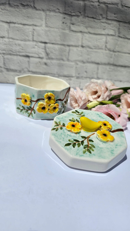 بر روی بدنه و درب این قندان، طرحهای برجسته گلهای زرد به زیبایی نقش بستهاند. این طراحی هنرمندانه و سهبعدی، حسی از لطافت و شادی را منتقل میکند. همچنین، شاخههای ظریف و برگهای سبز در کنار گلها، به این اثر جلوهای طبیعی و دوستداشتنی میبخشند. پرنده زرد رنگ که به آرامی روی درب قندان نشسته، این منظره زیبا را کامل میکند و به این اثر، شخصیتی منحصر به فرد و هنری میبخشد.