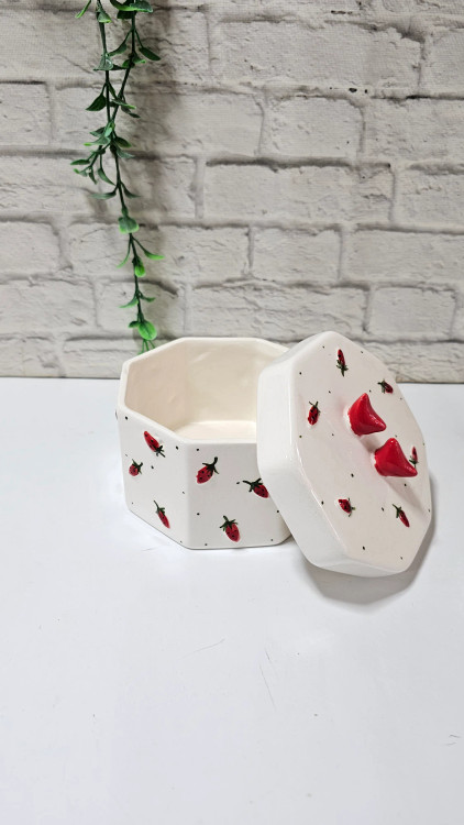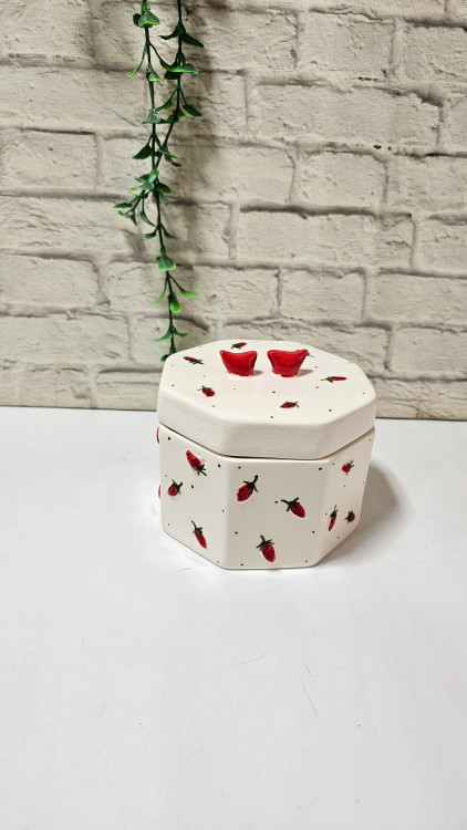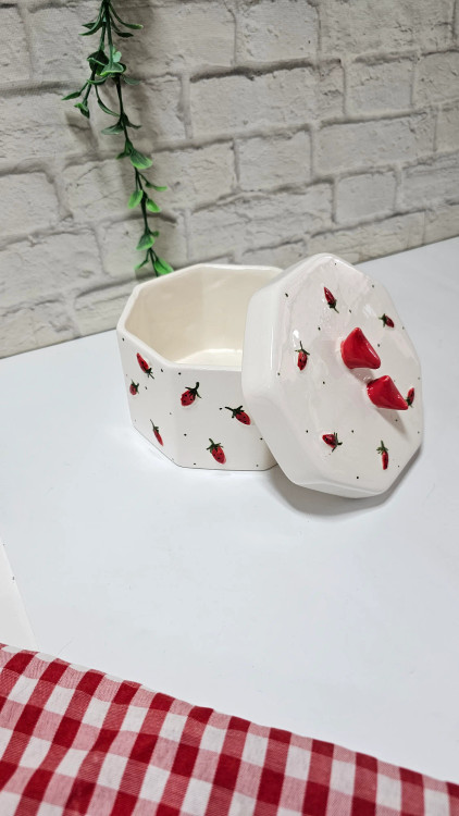 نقاشی دستی با جزئیات: بر روی بدنه هشتضلعی و سفید این ظرف، دهها توتفرنگی کوچک مینیاتوری با دست نقاشی شدهاند. این دانههای سرخ و کوچک، در کنار نقاط ریز مشکی، حسی از بافت فانتزی و شاداب را القا میکنند که به هیچ وجه با نمونههای چاپی قابل مقایسه نیست.