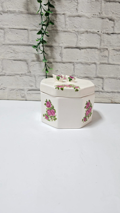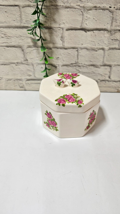 دستهگلهای صورتی و باطراوت: بر روی بدنهی هشتضلعی و سفید این ظرف، دستههای زیبایی از رزهای صورتی نقش بستهاند. این نقوش به گونهای در گوشهها قرار گرفتهاند که تعادل بصری فوقالعادهای ایجاد کرده و فضای خالی بدنه، درخشش لعاب درجهیک را به رخ میکشد.