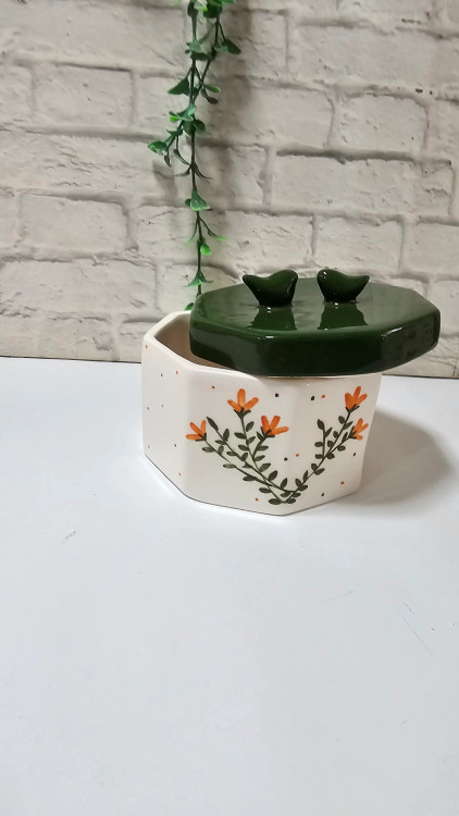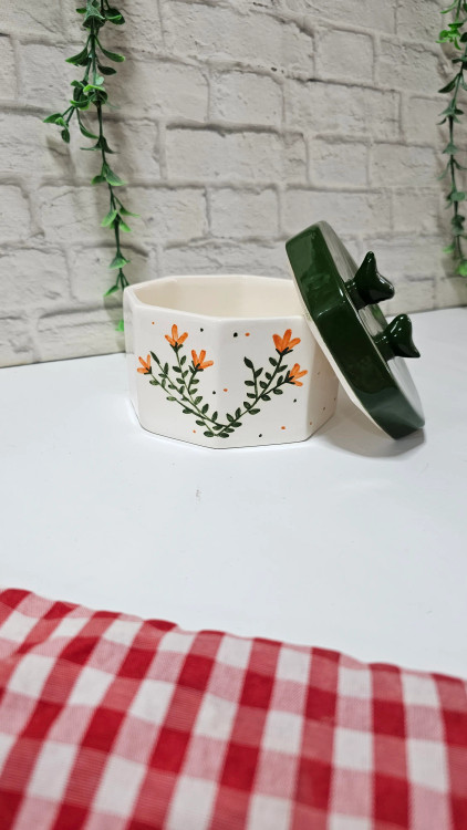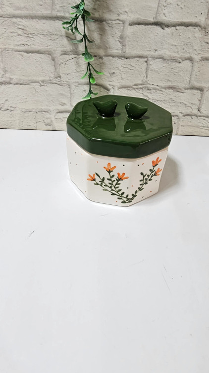 پرندگانِ سبز؛ نگهبانان ظرف: دو پرنده مینیاتوری که بر روی درب نشستهاند، همرنگ با بدنه سبز درب طراحی شدهاند تا به عنوان دستگیره، علاوه بر کاربرد، زیبایی بصری ظرف را به کمال برسانند.