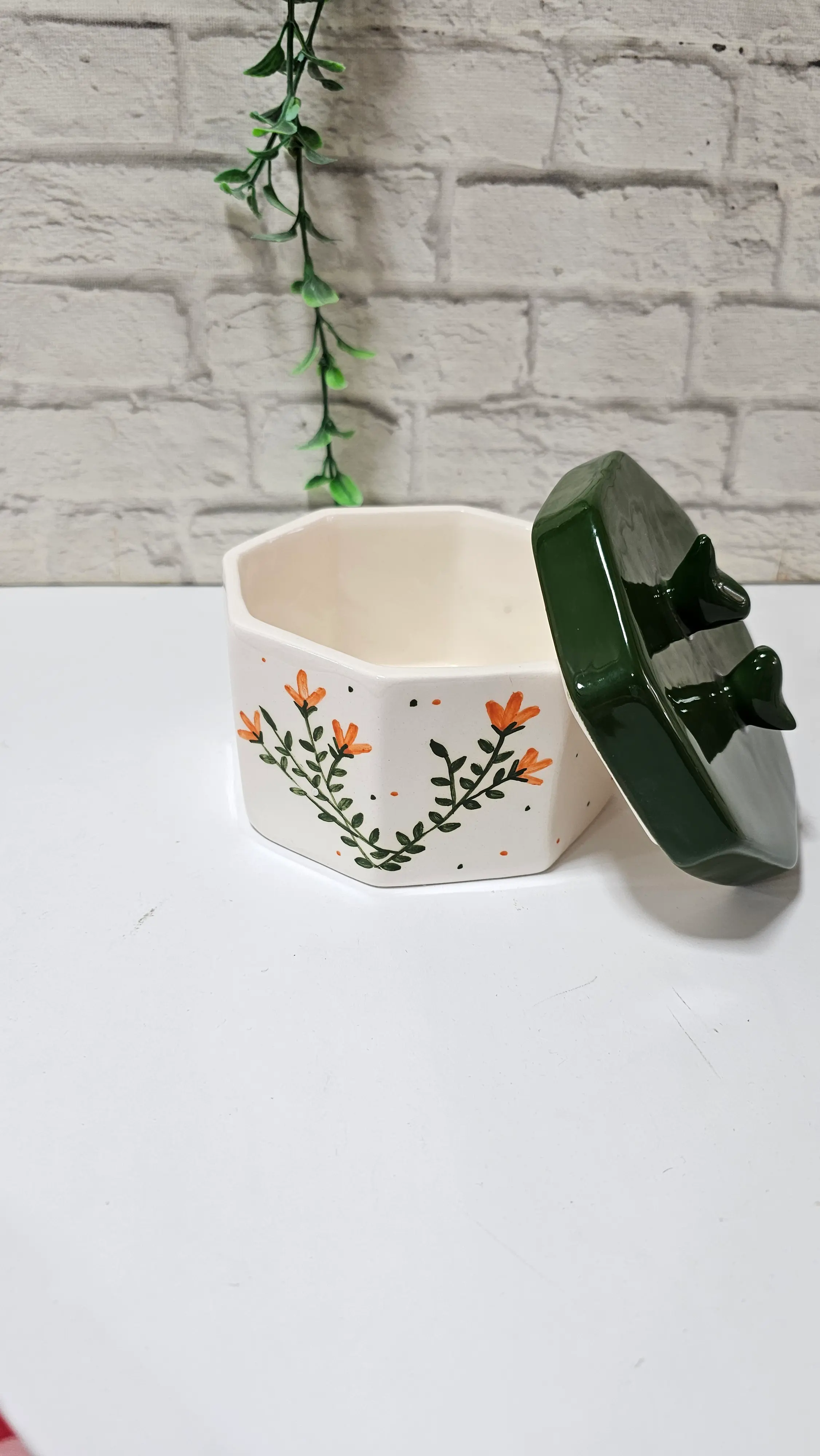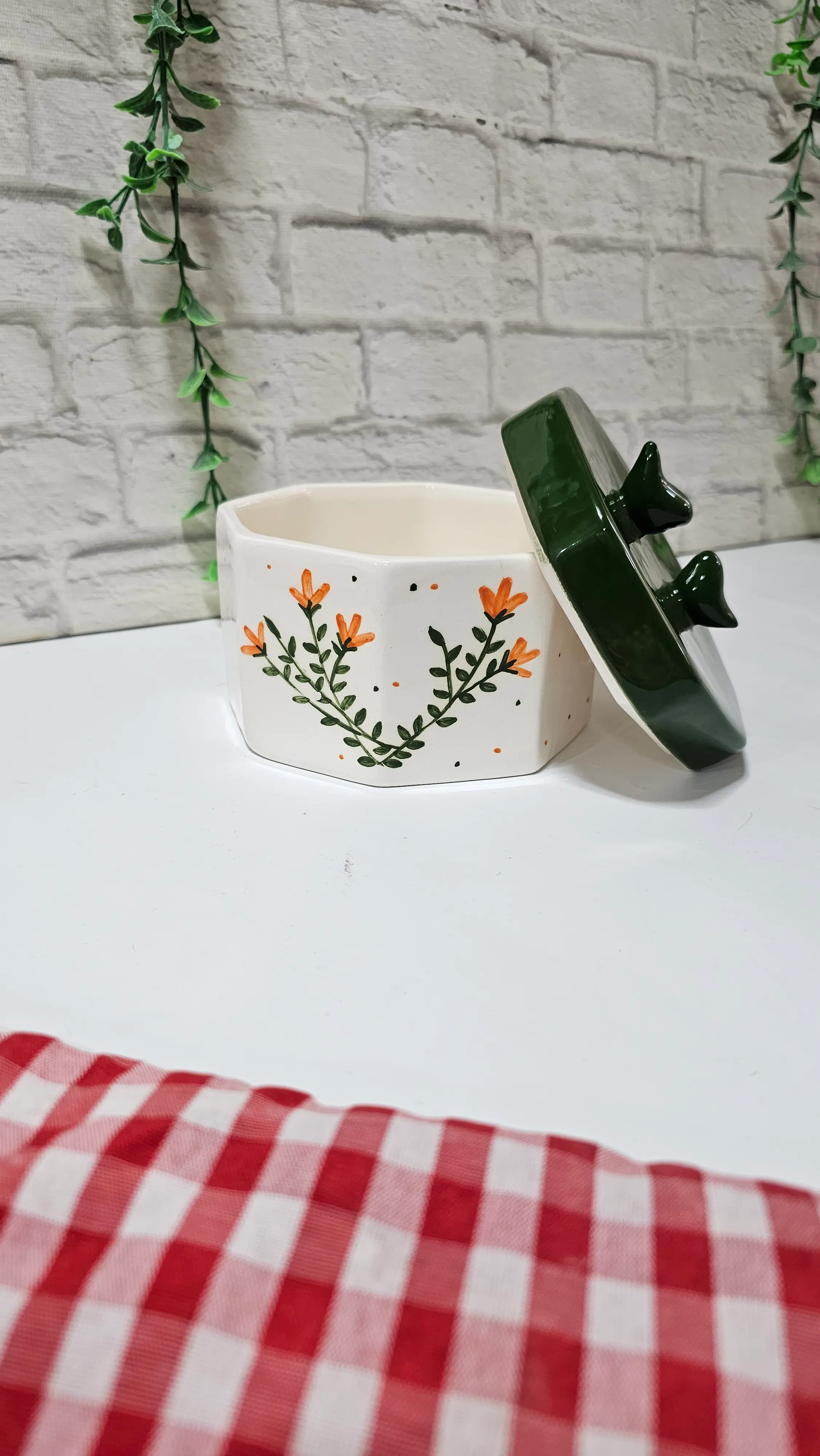 نقوش دستساز گندمی: بر روی بدنه هشتضلعی، خوشههای گیاهی با گلهای کوچک نارنجی خودنمایی میکنند. این نقوش به صورت مینیاتوری و با ظرافت تمام نقاشی شدهاند و نقاط ریز مشکی و نارنجی پراکنده در اطراف آنها، بافتی هنری و مدرن به کار بخشیده است.