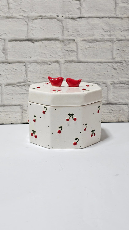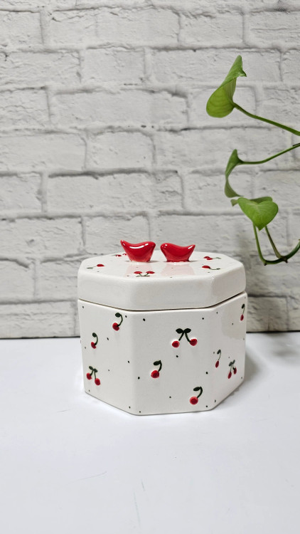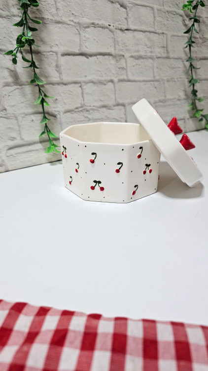 خوشههای گیلاس دستکش: بر روی تمام وجوه بدنه هشتضلعی ظرف، خوشههای دوتایی گیلاس با رنگ قرمز درخشان و برگهای سبز ظریف نقاشی شدهاند. هر گیلاس با دست فرم گرفته و رنگآمیزی شده تا حس زنده بودن را منتقل کند.