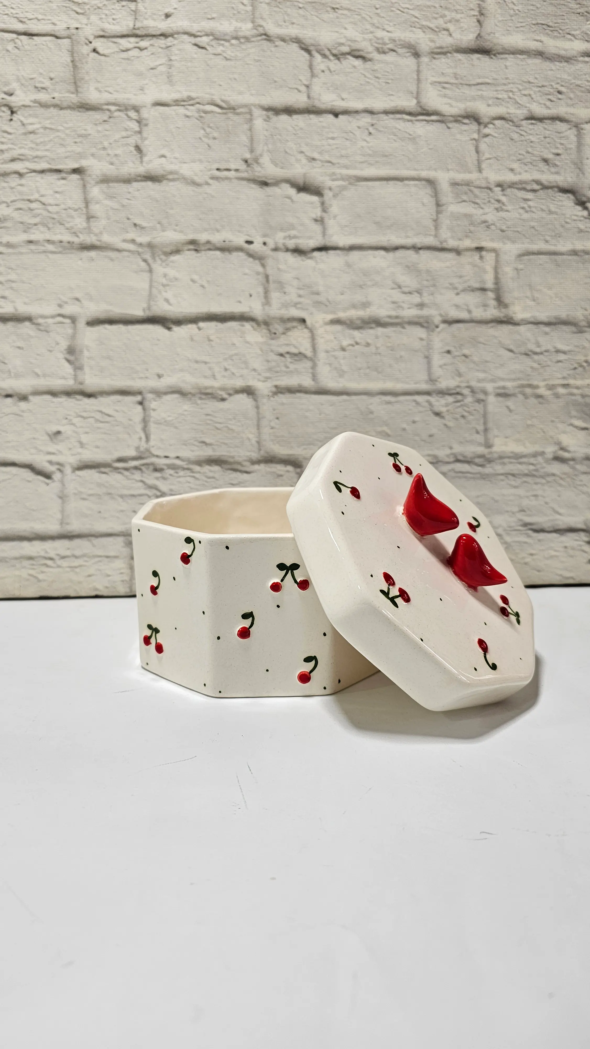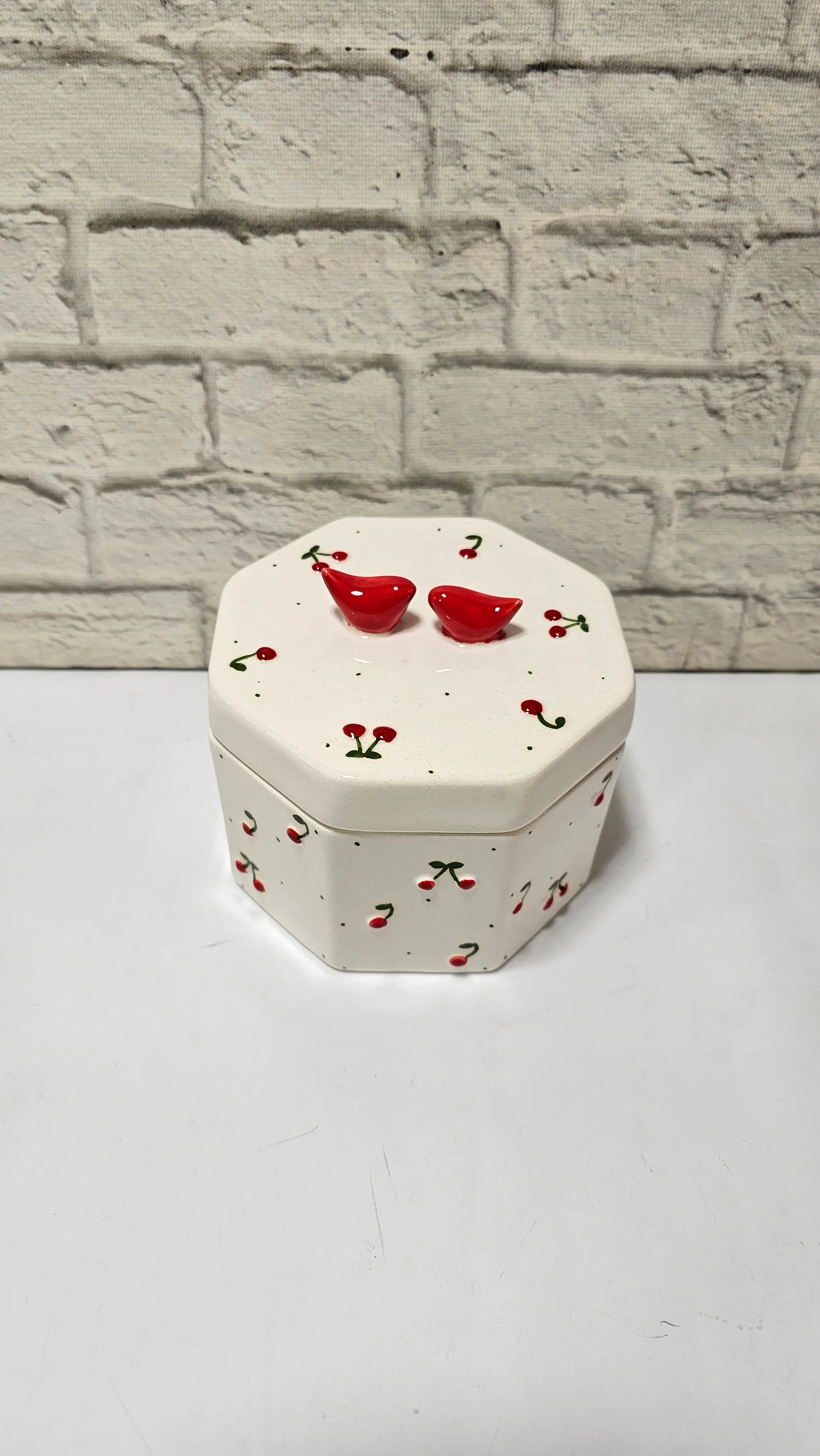 خوشههای گیلاس دستکش: بر روی تمام وجوه بدنه هشتضلعی ظرف، خوشههای دوتایی گیلاس با رنگ قرمز درخشان و برگهای سبز ظریف نقاشی شدهاند. هر گیلاس با دست فرم گرفته و رنگآمیزی شده تا حس زنده بودن را منتقل کند.